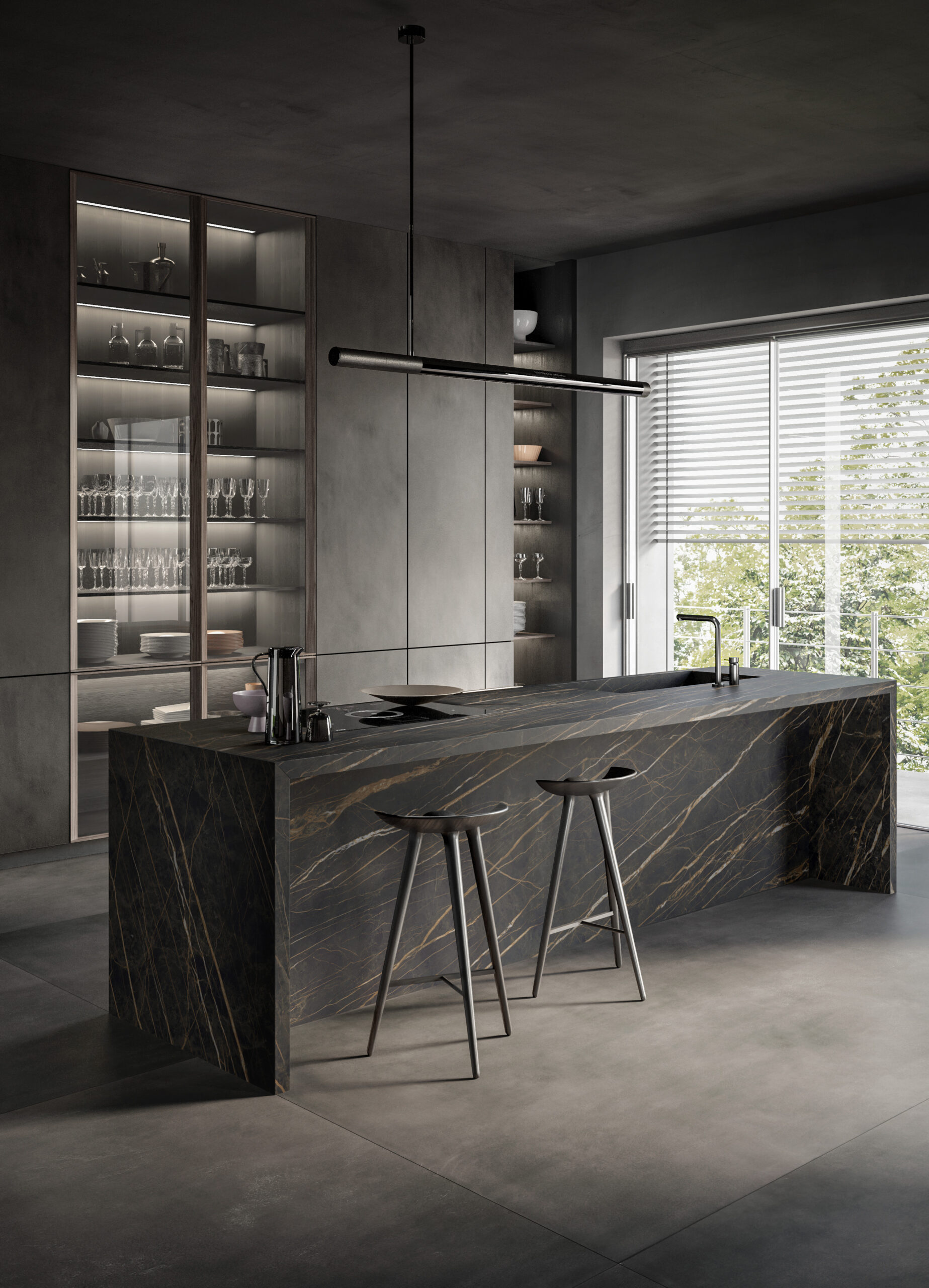 Statement kitchen countertop featuring a double waterfall edge. Shown in Sodalite Blue marble, in a polished finish.