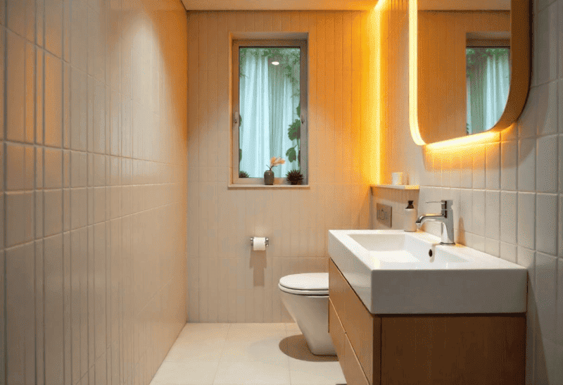 This trick works especially well in toilets. Try vertical subway tiles or slim stone strips. You don’t need to go full feature wall—just that little adjustment makes a difference.