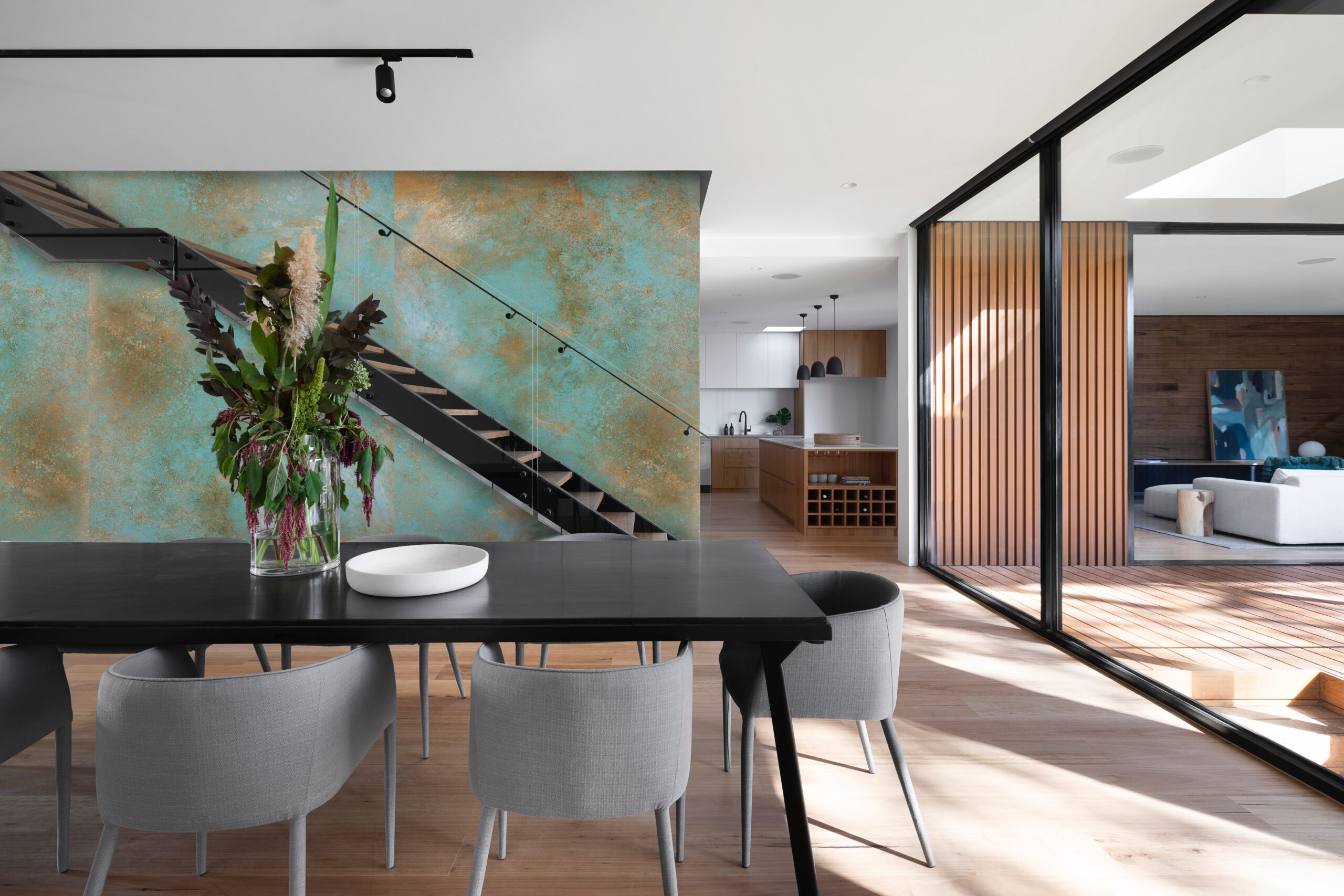 LAMINAM 5+ Ossido Verderame applied onto for residential dining room feature wall. LAMINAM is an ultra-thin, large format engineered ceramic slab from Italy, suitable for a wide range of architectural and interior applications.